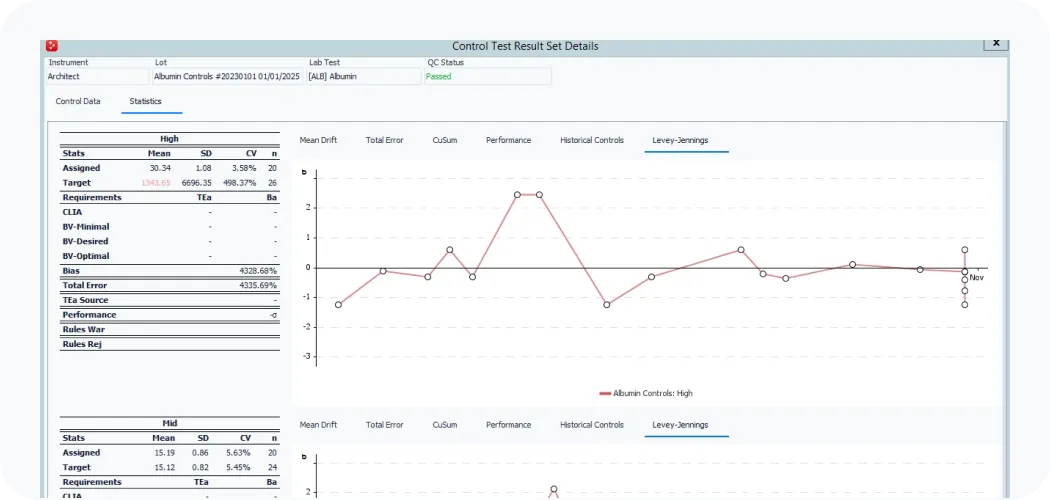 Ensure your laboratory consistently delivers accurate and reliable results with our Quality Control (QC) module. This module supports Westgard rules, the Levey-Jennings chart, and other statistical process control methods while systematically tracking, monitoring, and analyzing various aspects of your lab workflow, ensuring that the highest standards of laboratory operations are upheld. The QC module shines when dealing with high volumes of complex tests, as it systematically reduces errors and improves efficiency by providing a visual snapshot of your laboratory's performance, allowing for the swift identification of trends and deviations.