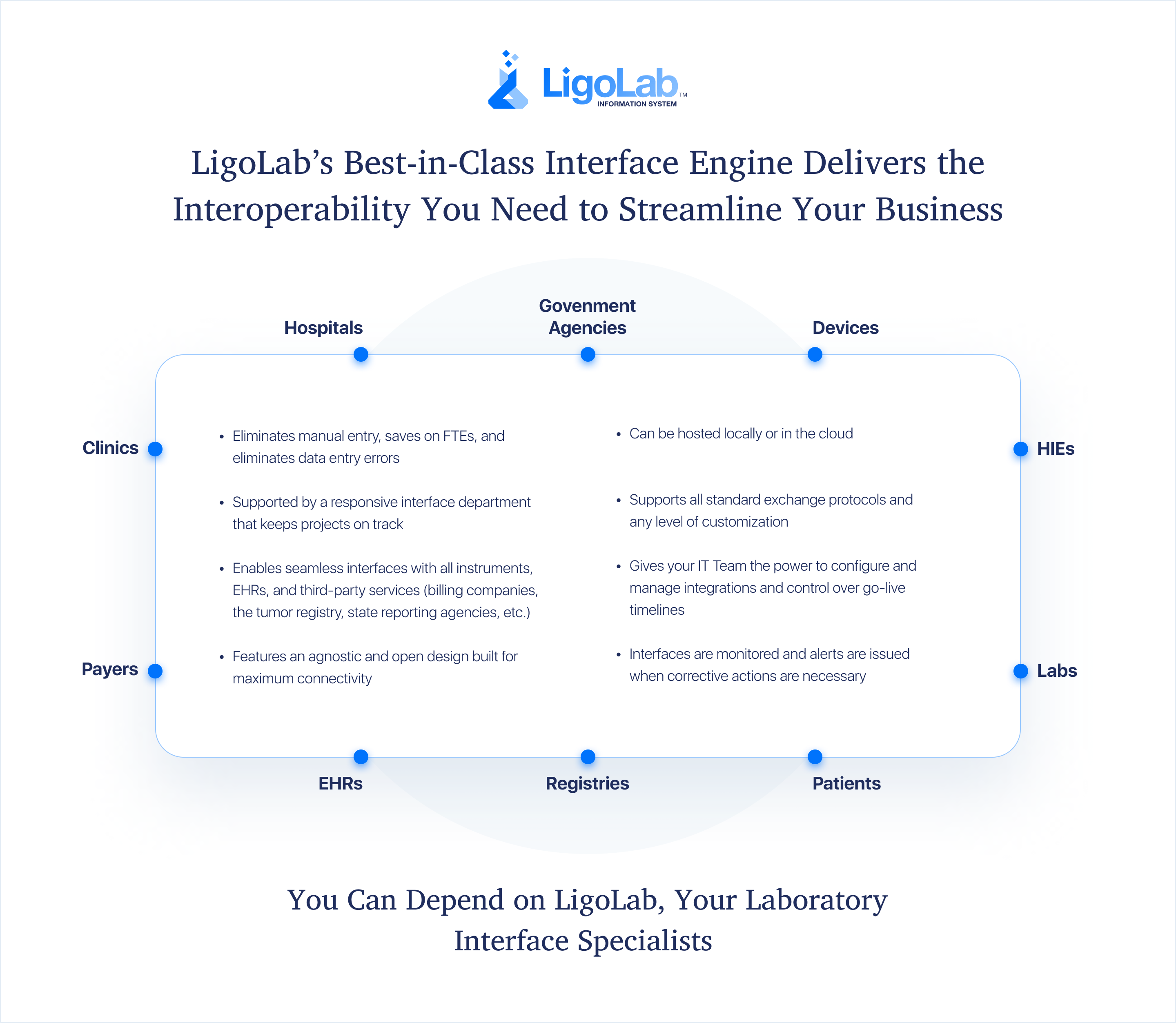 LigoLab’s interface engine is another example of how innovative laboratory information system companies that produce advanced lab information systems can provide customer-desired end-to-end lab connectivity. LigoLab does this while also taking full responsibility for all laboratory technical operations and finances by fully supporting the in-house laboratory billing process (with its all-in-one medical LIS and lab billing solution), minus the redundancy and data silos that come from relying on multiple legacy laboratory software systems.
